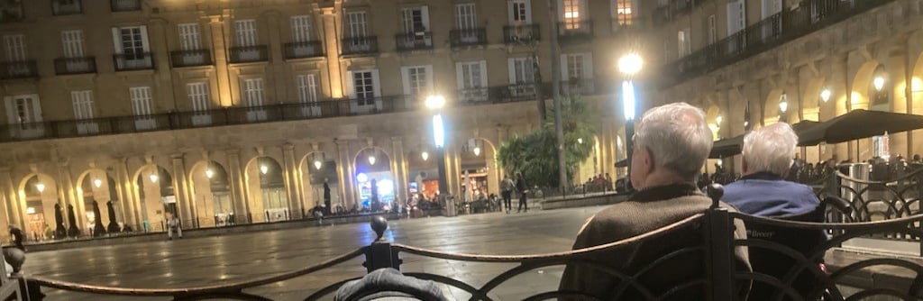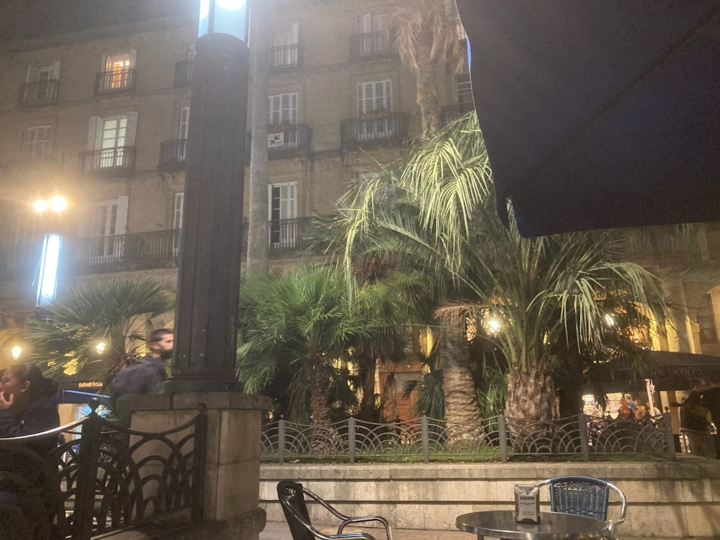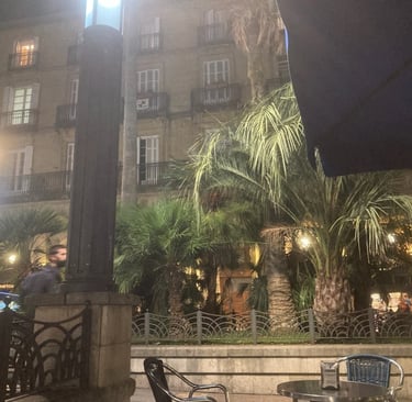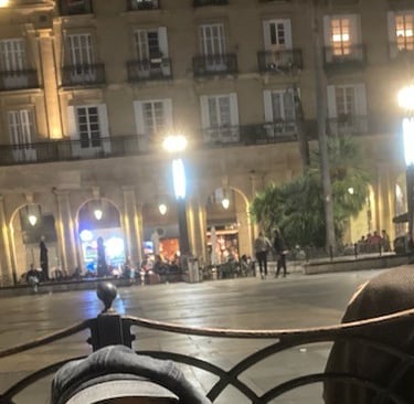 We arrived at the Guggenheim and spent the rest of the afternoon getting to know it. But it was tiring, so we returned to our hotel , vowing to come back the next morning so that we could take everything in. Our train wasn't scheduled to leave Bilbao until the next afternoon. Later that evening we strolled the balmy streets once more, coming upon the old quarter, where the narrow streets are bursting with interesting shops and bars. In the centre of this historic area lies a beautiful square surrounded on all four sides by arcades. As darkness fell , people gathered here to pass the evening eating and drinking. A musician strolled around the tables playing his classical guitar. There was such a happy feeling in the air that we vowed to return another day.