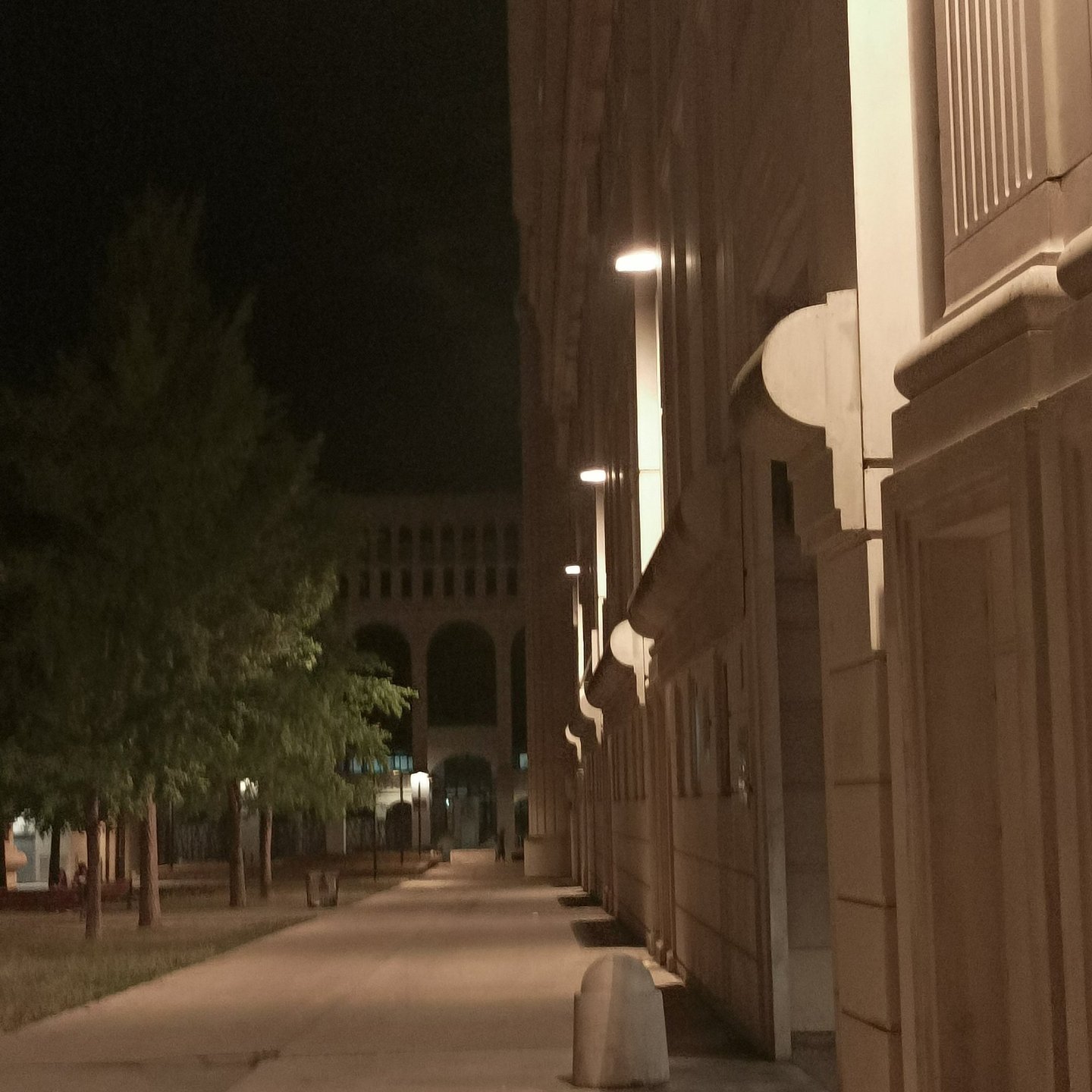 Once there, the evening felt so pleasant we decided to complete the journey on foot. Our route took us through the enormous shopping arcade of The Polygone. As we exited this complex at the other end ,we were faced with the magnificent entrance portal to The Antigone, a neo classical commercial and residential development, which had been designed by the architect Ricardo Bofill , under the auspices of the ambitious maire Georges Frêche, and completed in the eighties. It is here that we were staying, and we were already familiar with its enormous fluted columns, graeco roman features, and abundant curves. But to see it at night, when the beige coloured imitation stone was all lit up, was a wonderful new experience.