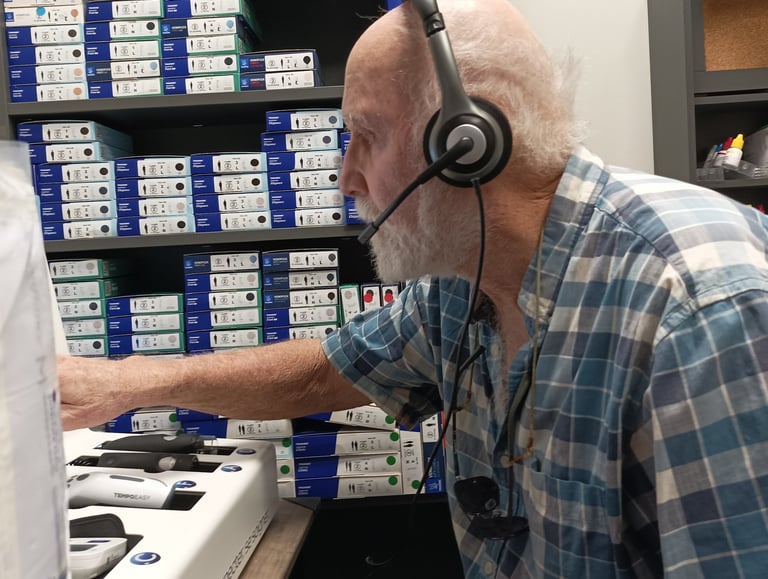 Knowing that pharmacists can sometimes give advice, we decided to try our local pharmacy. Of course, advice would be all very well, but they would not be able to prescribe anything, such as antibiotics, if they were deemed necessary. "Pas de problème," ( no problem) the friendly pharmacist said. She took us to a tiny room, where , alongside boxes of bandages and dressings; crutches; surgical stockings and orthopaedic shoes, we spotted something different. What was this? Apparently this small gadget was to be B.'s doctor for the day.