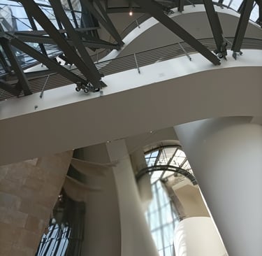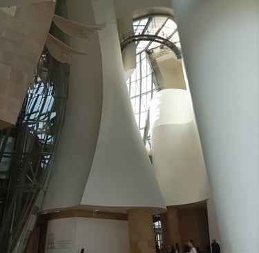 How can I possibly do justice to this amazing structure in this small blog. Let me try and give you just a little taste of what we saw and felt. The building itself takes your breath away. It is set on the banks of the river in a prime setting. There are wide riverbank walkways, and broad staircases all around where people can walk and gather, and it is well integrated with the central part of the city. Conceived in the late twentieth century by the Canadian American architect, Frank Gehry , walls, giant towers and enormous curves are all clad in glass, limestone and titanium, and these materials are echoed inside. It was this building alone that drew me to Bilbao, and I was not disappointed.