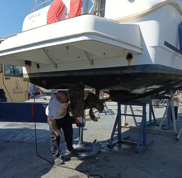 'Atelier Bilbo', a boat repair yard, is situated in Balaruc, at the eastern end of the Etang de Thau. Nearby lies the spa centre of Balaruc-les-Bains. Not for us the mud baths and spa treatments, however. We were heading for the busy workshops of the boating world, where people are currently busily repainting and anti-fouling their yachts and boats for the coming season. Fortunately, this was little more than a short boat ride from our mooring on the canal. Our propeller was damaged, so we didn't want to risk going too far. As we drew close, we spotted the grue (or crane) which was to lift the boat out of the water, and we moored alongside. Unlike the mobile heavy duty grues at Chantier Allemand( see an earlier blog) , here, the straps which cradle the boat must be fitted underneath the boat first, and then attached to four hooks on the crane. It was a skilled job, and we exchanged greetings with Marc who was in charge of this operation. We were cautious to remain at a distance as our boat dangled precariously in the air before it was skilfully manoeuvred into place on its cradle.