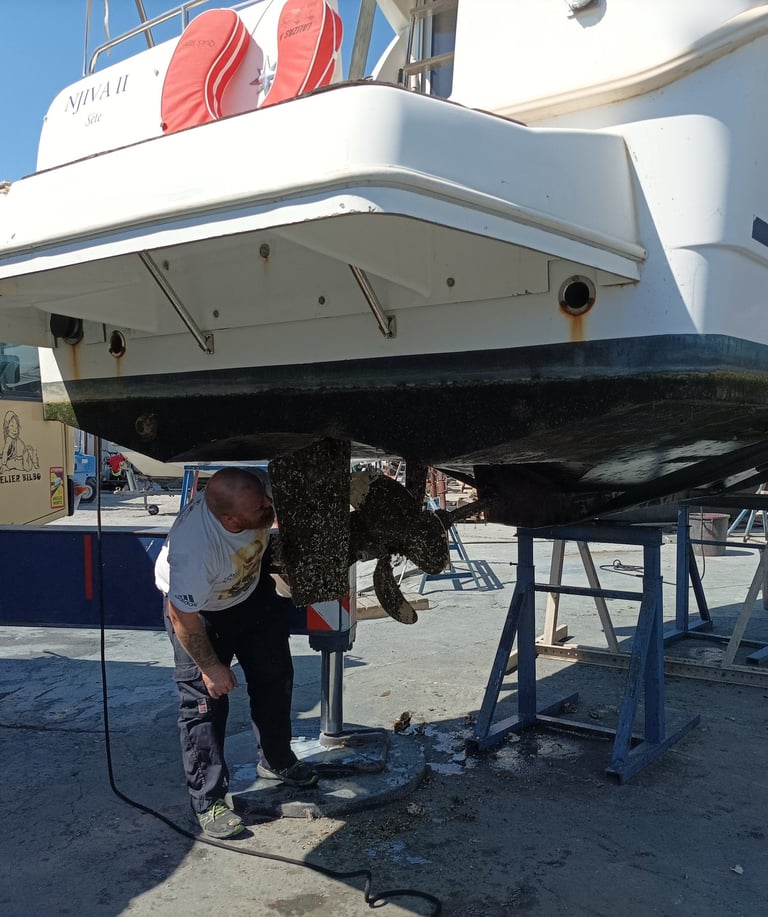 Once our boat was in place, Marc inspected the damage. The propeller is bent , and has not broken off. If all goes well , it can be repaired at their workshop forge. That is good news. A coating of anti-fouling will also be added for the coming season.