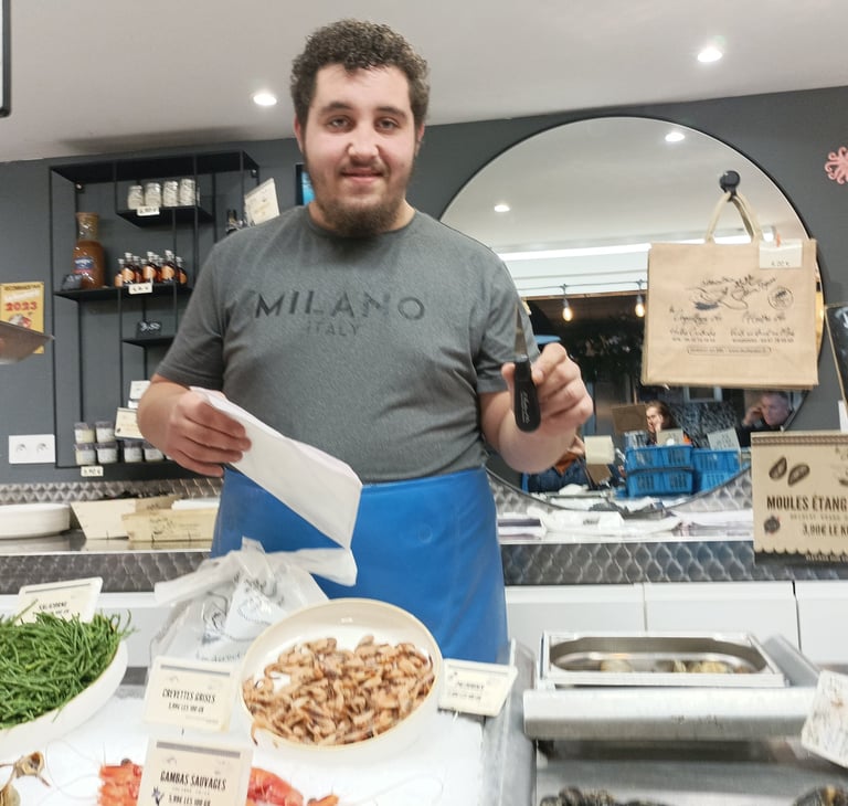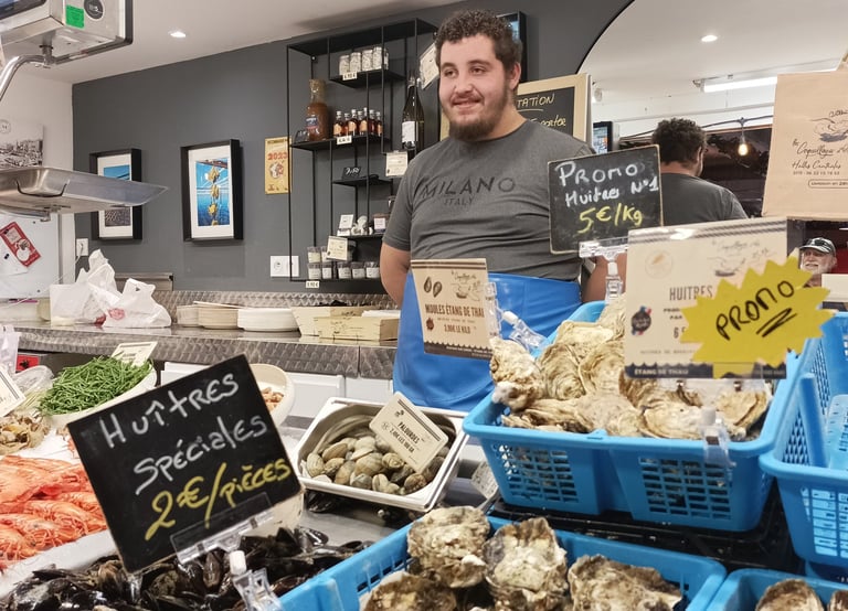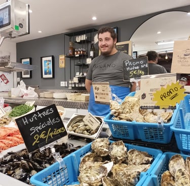 Les Halles is a large indoor market which is renowned for its sale of fresh fish and sea food. It was our primary purpose to buy some good fresh fish to cook for our lunch. There are lots of tables and chairs outside where you can eat sea food and drink wine at a very reasonable price, and yet more indoors, but today the tables mostly lay empty. What's more there was not a single fresh fish to be bought. The giant stainless steel slabs which belong to the fish retailers all lay swabbed, and bare. Finally we spotted a sea food stall, where we decided to buy oysters and palourdes(clams) instead. "But where are all the fresh fish stalls?" we asked." It is Monday," the stallholder explained. "The boats won't come in until this evening. "